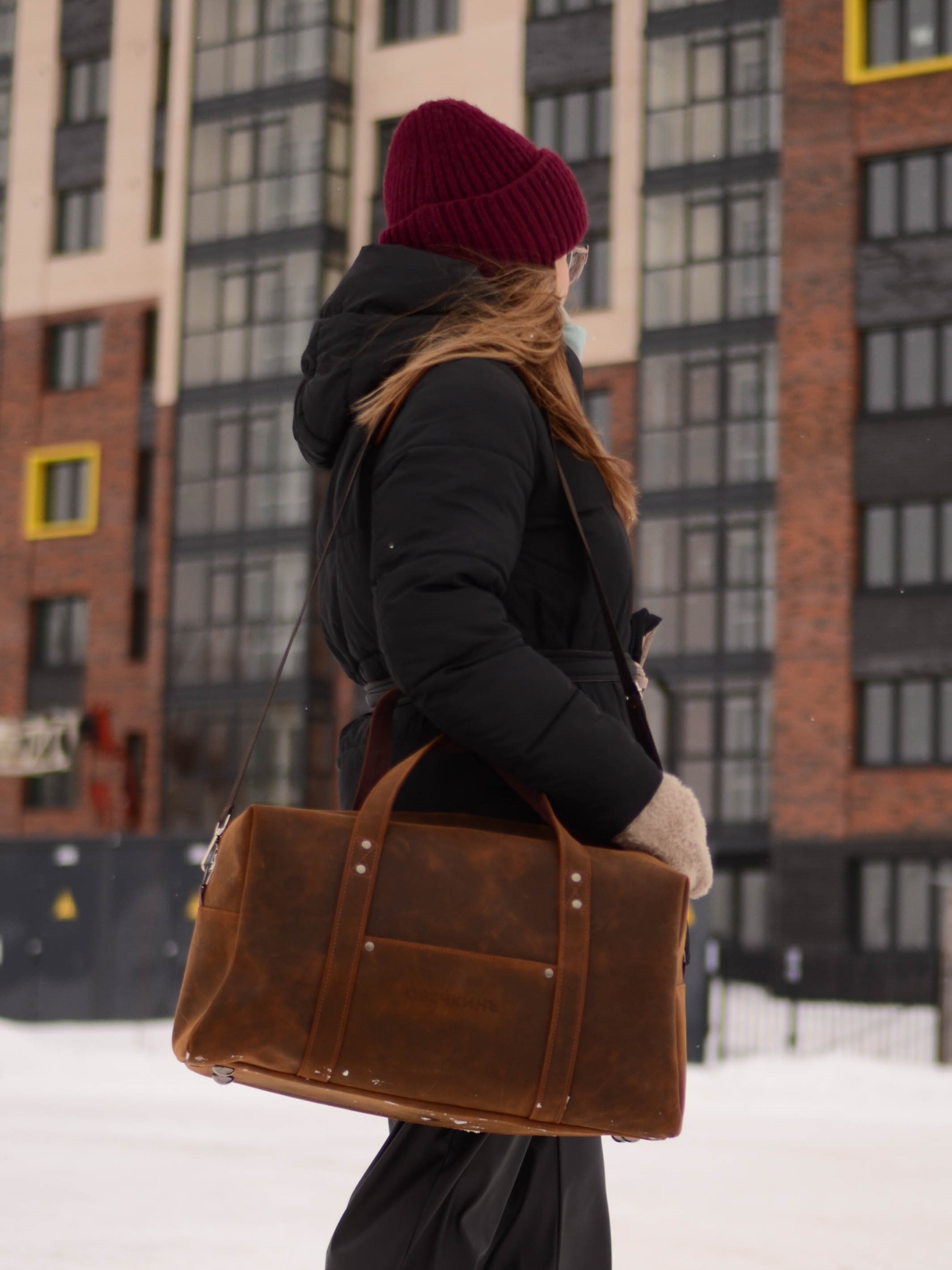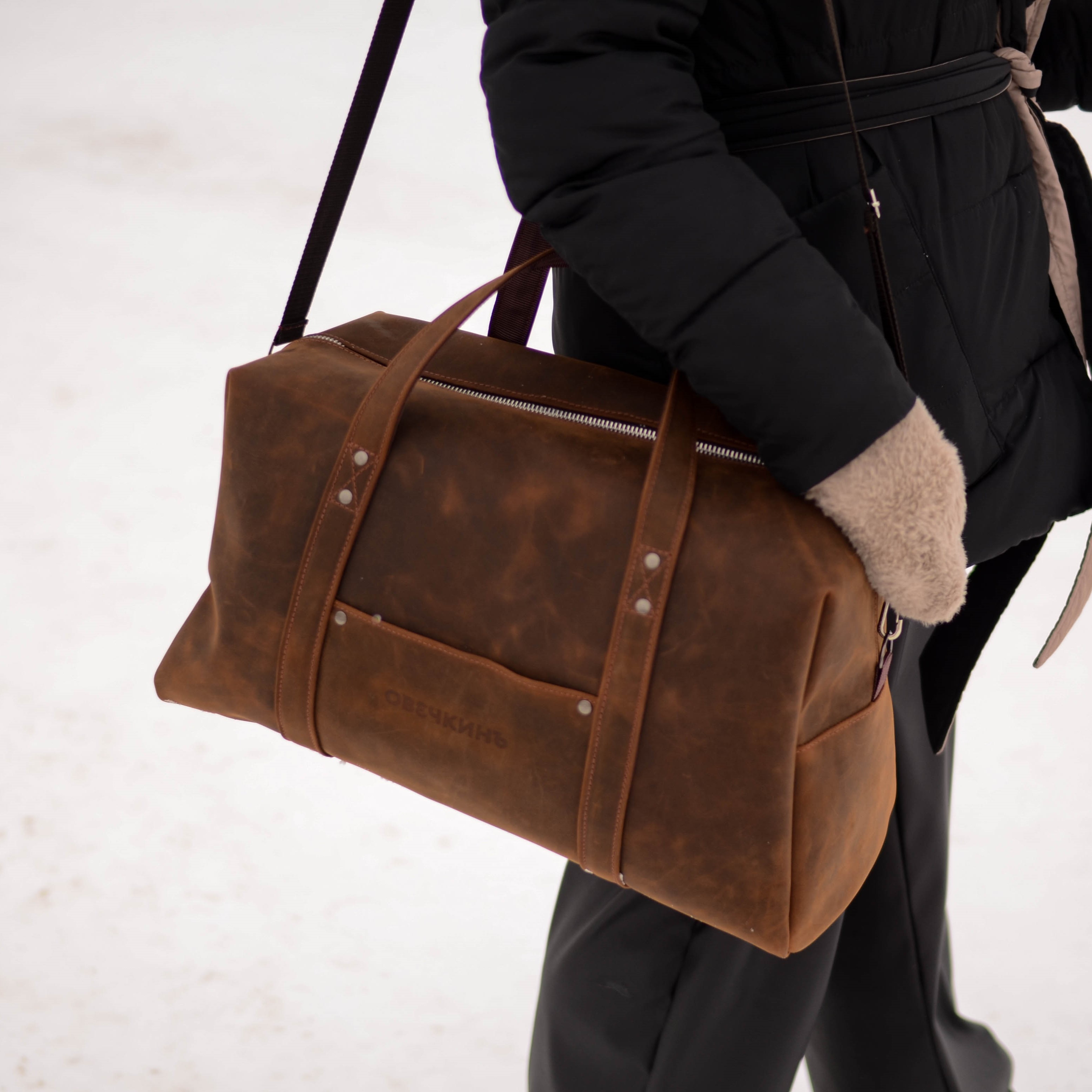 A large bag made of genuine leather is perfect for work trips, business trips, in cases where you do not need to take a large suitcase with you for a small number of things.