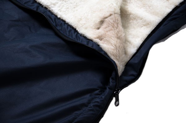 - an internal windproof flap along the zipper prevents cold air from entering and protects fabric and sheepskin from damage;
