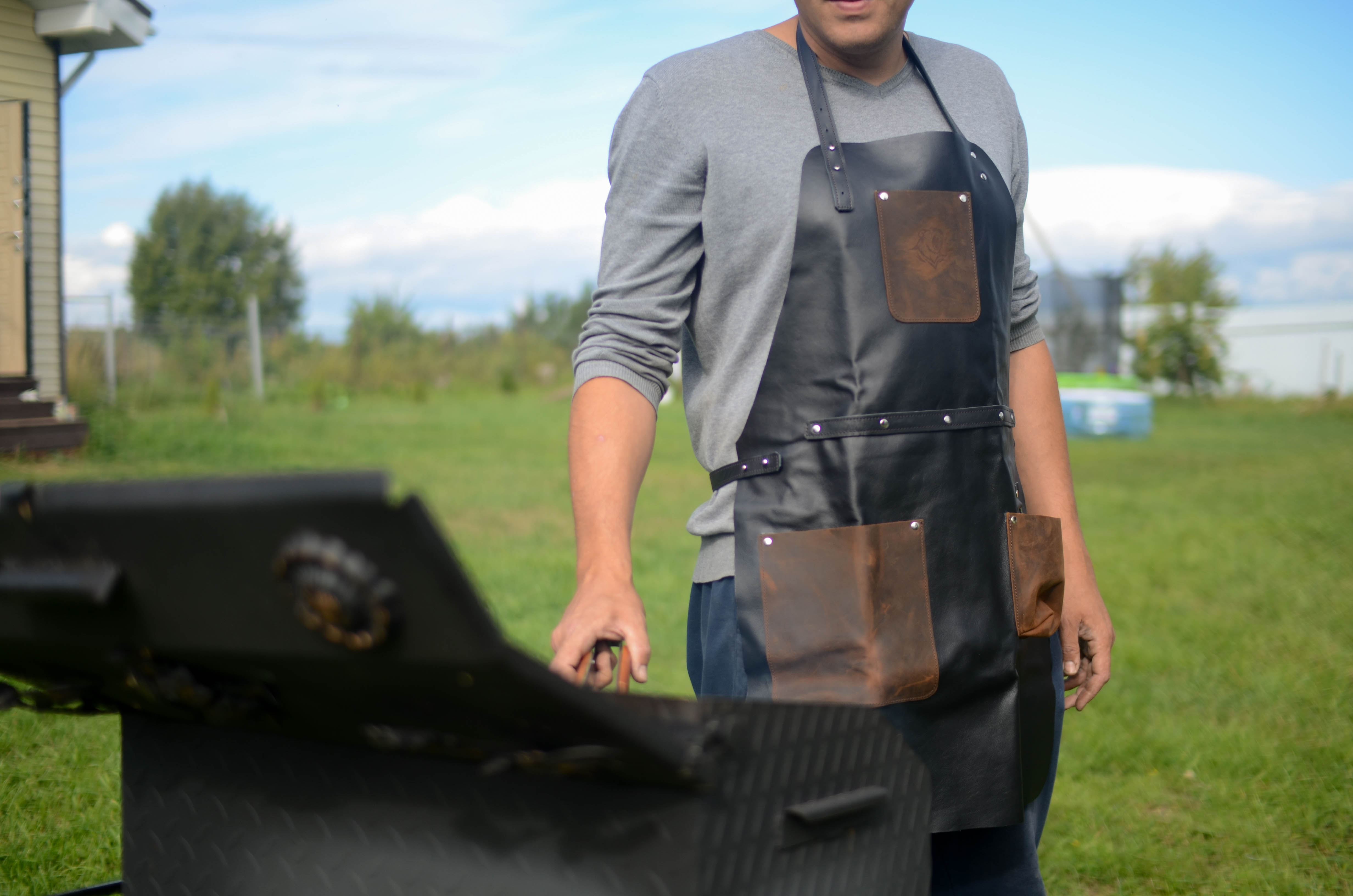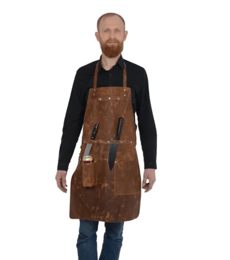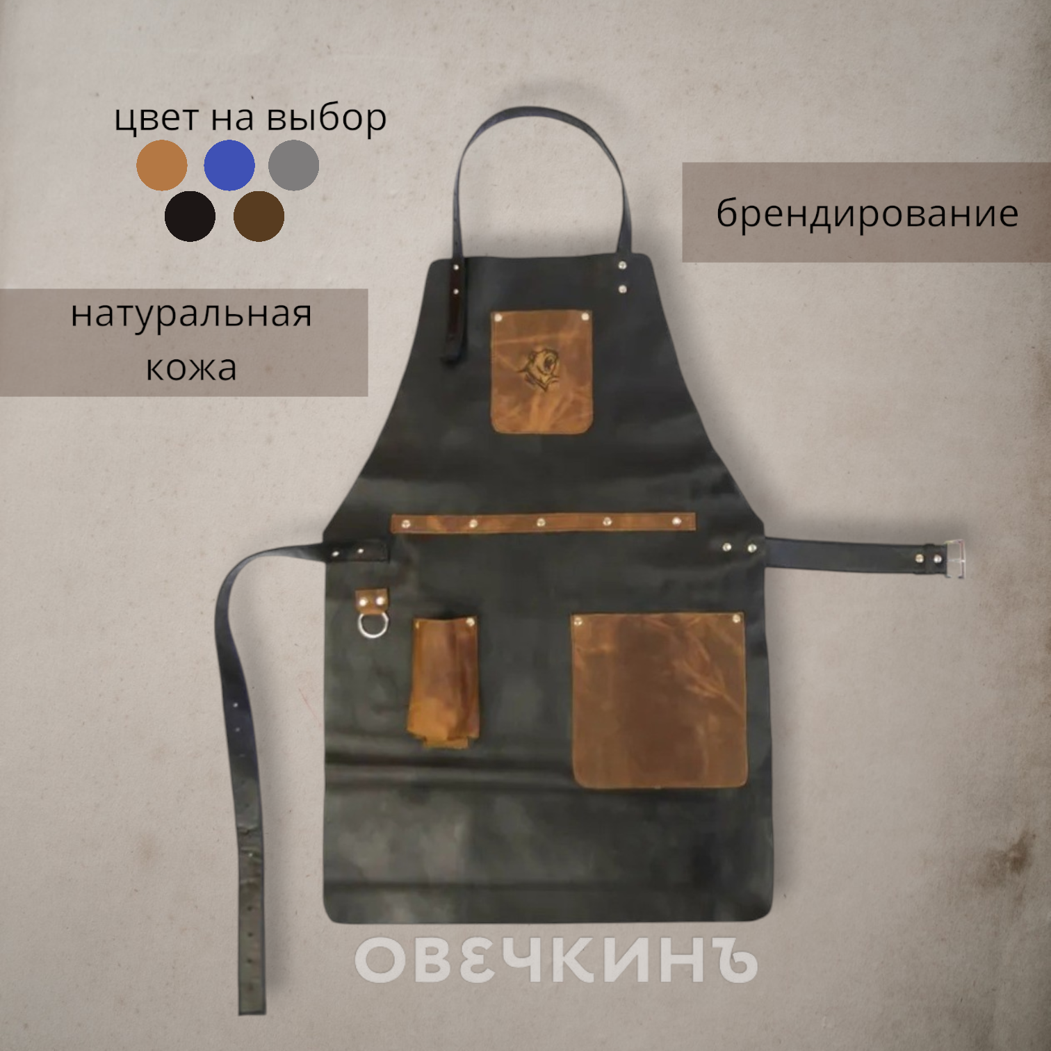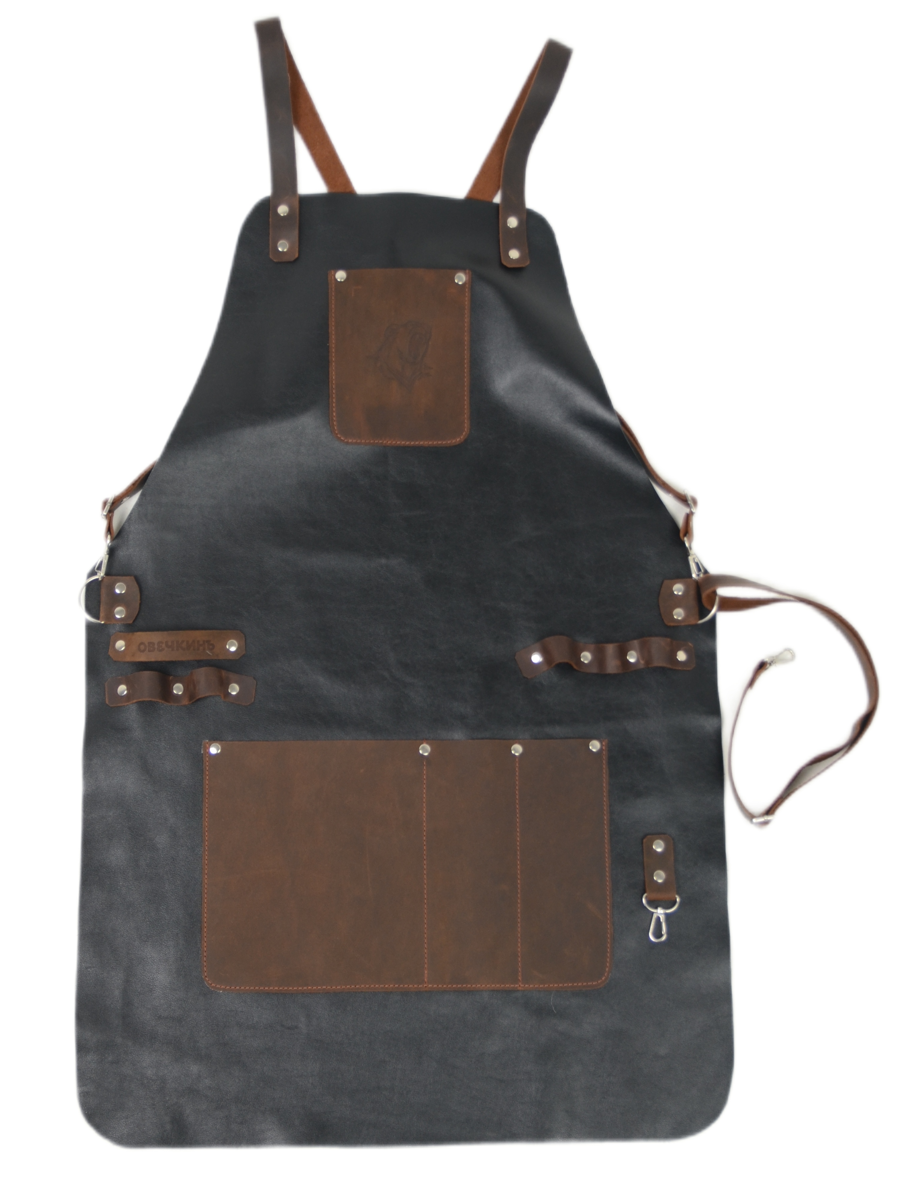 Apron made of genuine cattle leather, sheepskin leather. The apron has a classic cut, an external roomy pocket, as well as a chest pocket for a phone with laser engraving. Tool or knife straps with towel ring. One pocket at the bottom and a small top pocket. All the details are thought out so that the apron becomes an assistant in work. It is suitable for brutal cooks, craftsmen, artisans. This apron is made with genuine crust leather - thick, dense, made from cattle skins. The apron is treated with finishing products to protect against moisture and dirt, with proper care, the leather apron will last a very long time and over time will only become more attractive and brutal. Exact repetition is not possible, since each piece of skin is unique and has its own characteristics. Therefore, each leather apron is one of a kind.
