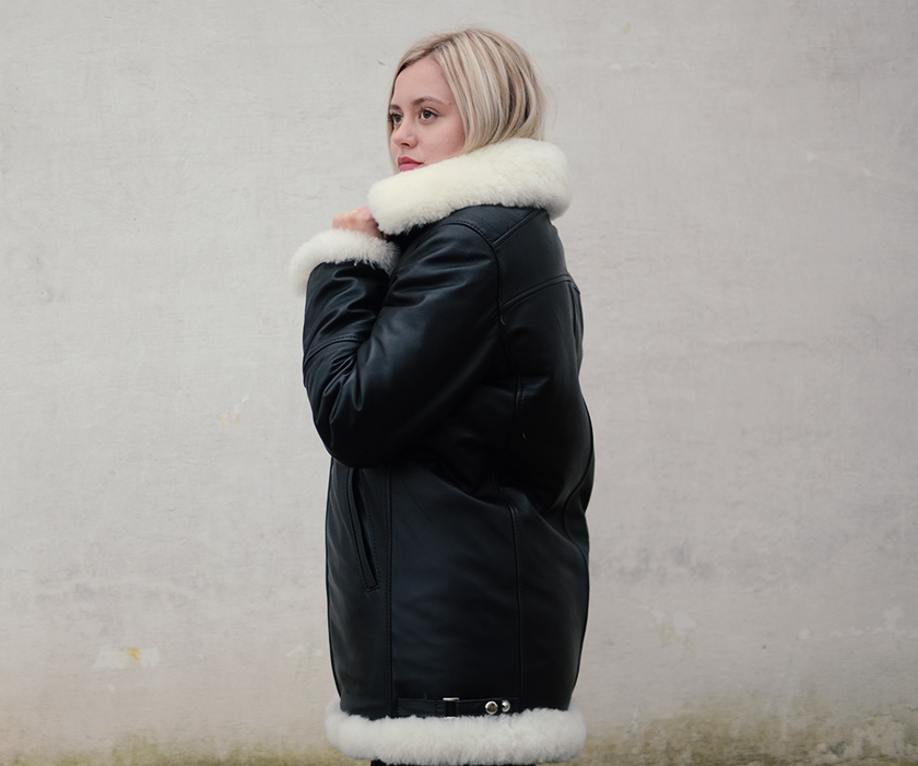 - an internal windproof flap along the zipper prevents cold air from entering and the sheepskin from being damaged;